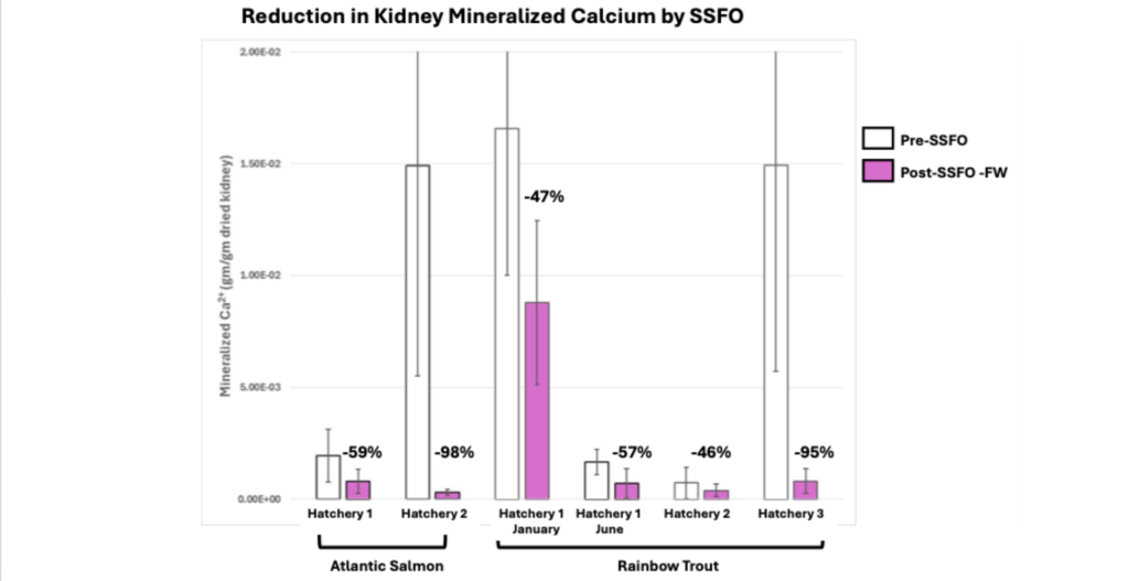 In short: Seawater can relieve stress and slow further damage from nephrocalcinosis. SSFO provides this same relief in addition to actively reducing mineralized calcium while the fish remains in freshwater.
